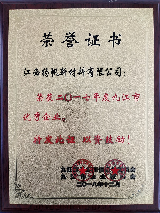 江西揚帆新材公司喜獲“九江市優秀企業”稱號