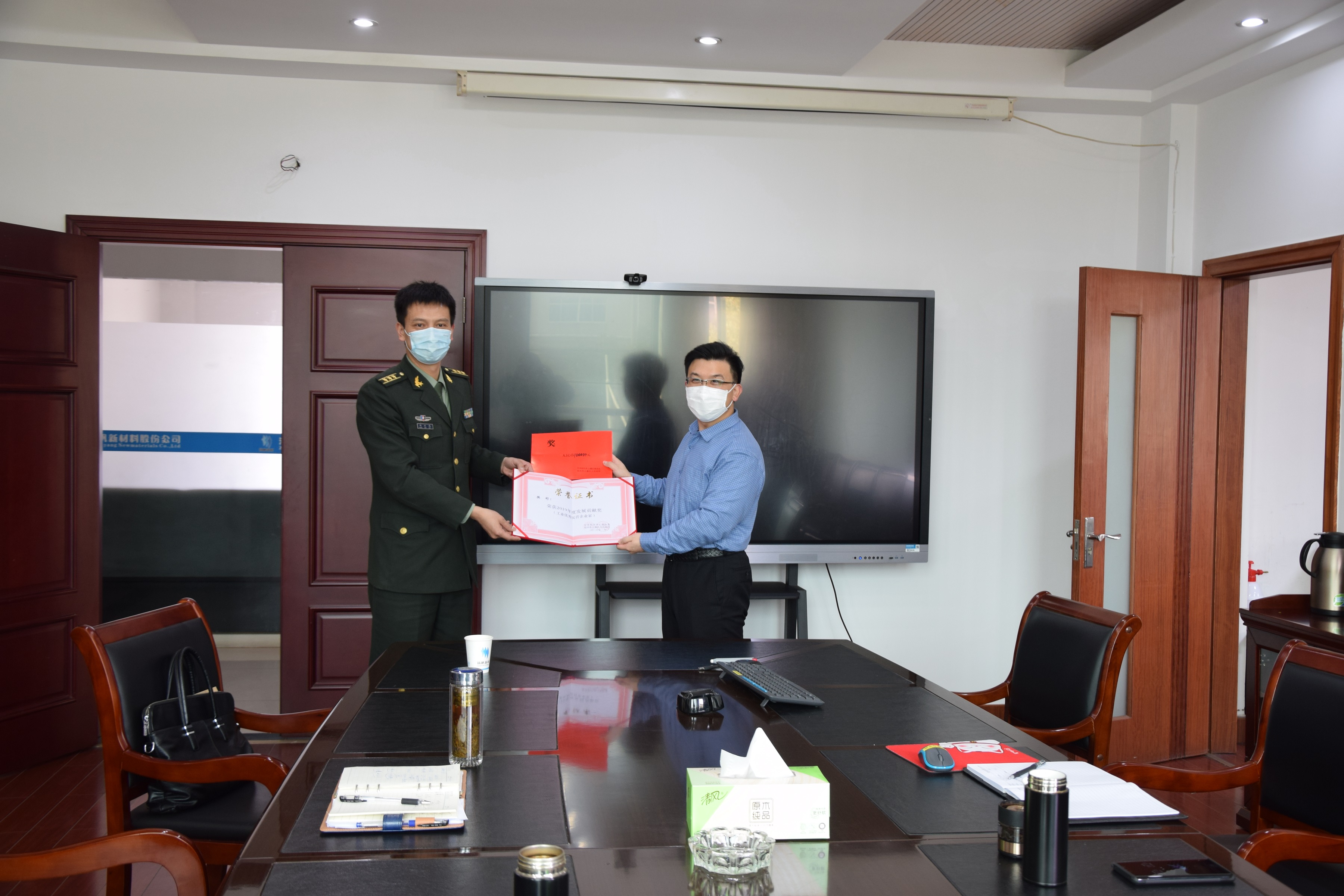 3月11日下午,上虞區(qū)委常委、區(qū)人武部政委項延玳一行蒞臨揚帆新材調(diào)研企業(yè)防疫工作,并為揚帆新材董事長樊彬頒發(fā)上虞區(qū)2019年度發(fā)展貢獻獎。揚帆新材總裁李耀土、董事會秘書樊相東等陪同并匯報工作。