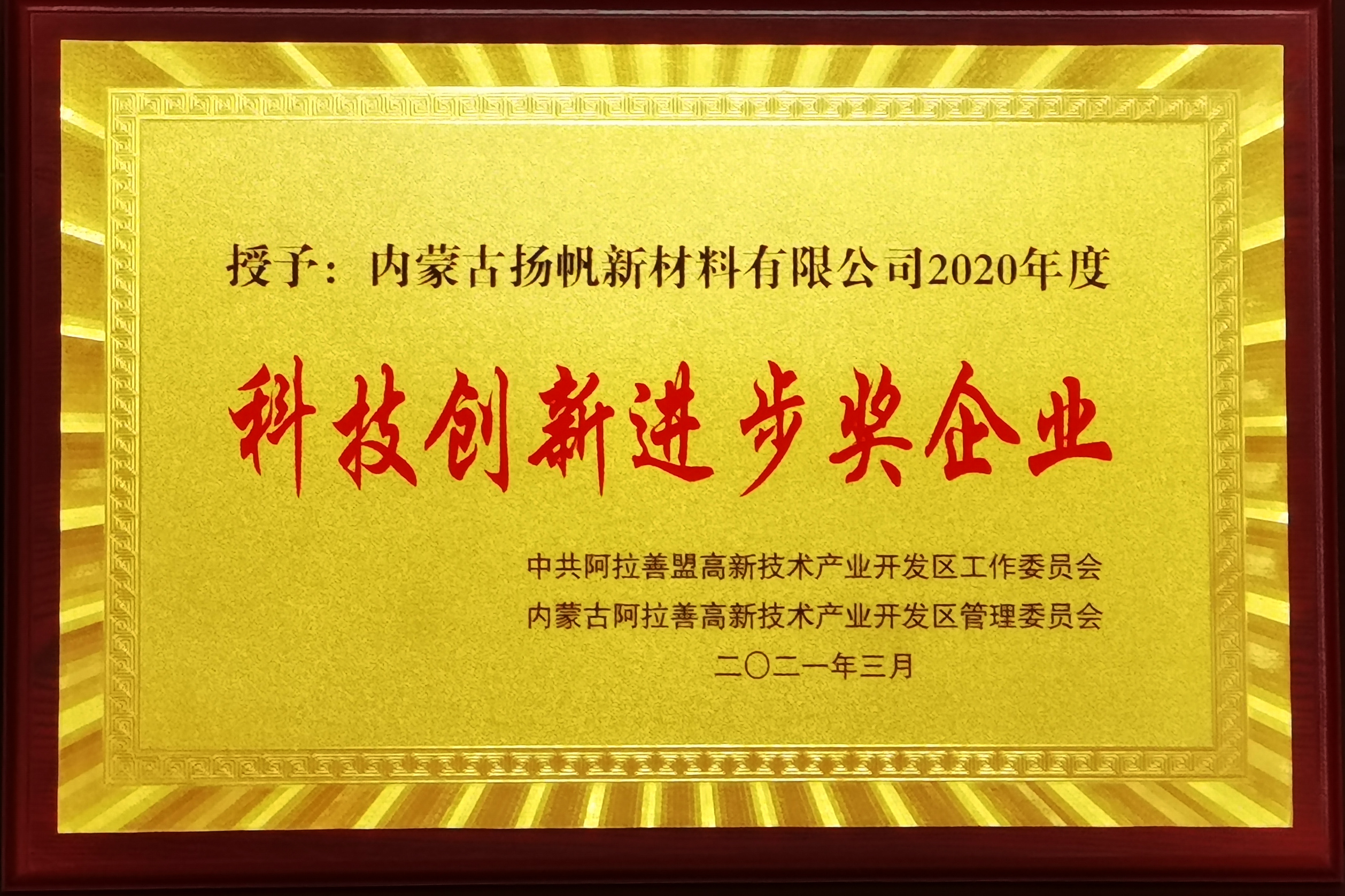 3月9日,阿拉善高新技術(shù)開發(fā)區(qū)召開“2021年度高新區(qū)、示范區(qū)黨的建設(shè)工作會(huì)議”,通報(bào)表彰了高新區(qū)、示范區(qū)在疫情防控和為地方經(jīng)濟(jì)社會(huì)發(fā)展做出貢獻(xiàn)的先進(jìn)集體和先進(jìn)個(gè)人。內(nèi)蒙古揚(yáng)帆新材料有限公司榮獲“2020年度科技創(chuàng)新進(jìn)步獎(jiǎng)企業(yè)”,公司總經(jīng)理劉輝獲“2020年度優(yōu)秀企業(yè)家”榮譽(yù)稱號(hào)。