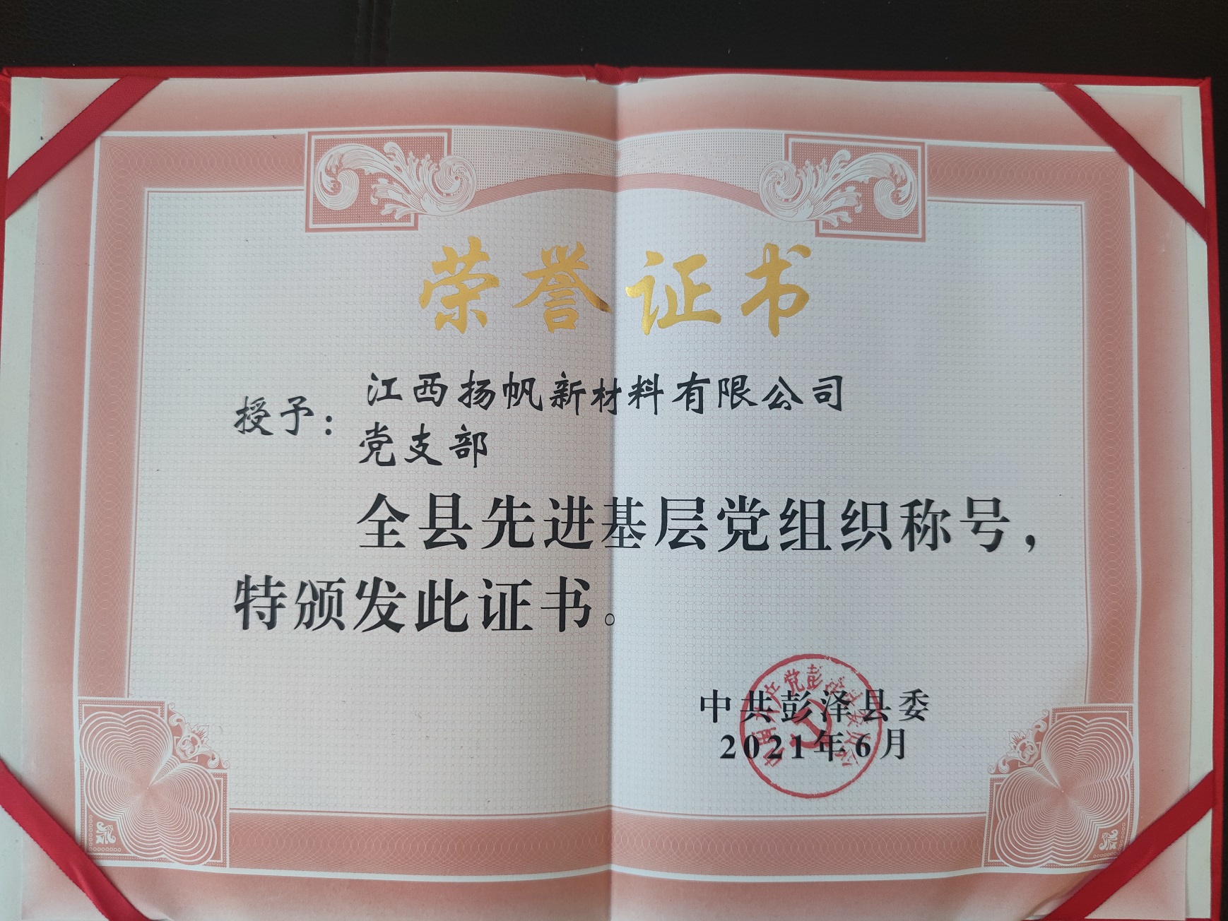 近日,為慶祝建黨100周年,中共彭澤縣委做出關(guān)于《表彰彭澤縣優(yōu)秀共產(chǎn)黨員、優(yōu)秀黨務(wù)工作者和先進(jìn)基層黨組織的決定》。江西揚(yáng)帆新材料有限公司黨支部榮獲“全縣先進(jìn)基層黨組織”榮譽(yù)稱號(hào)。