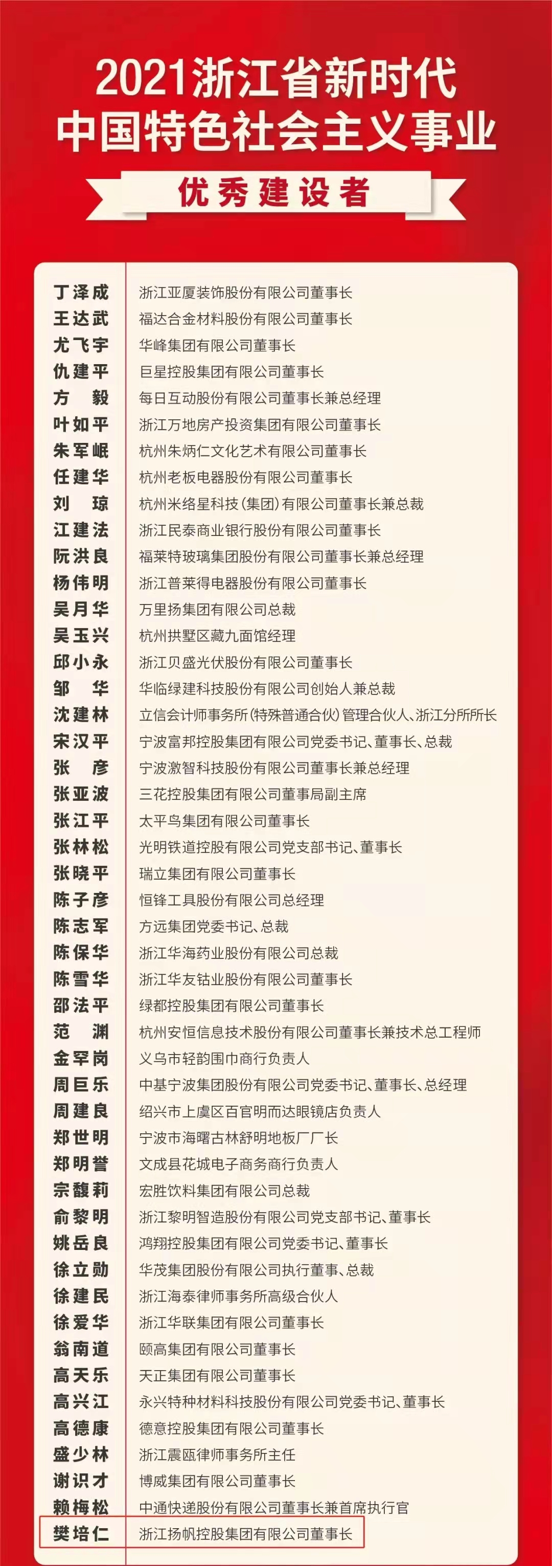 會(huì)上表彰了48位“2021浙江省新時(shí)代中國(guó)特色社會(huì)主義事業(yè)優(yōu)秀建設(shè)者”,揚(yáng)帆新材創(chuàng)始人、董事、控股股東浙江揚(yáng)帆控股集團(tuán)有限公司董事長(zhǎng)樊培仁先生繼2007年獲評(píng)“浙江省第二屆優(yōu)秀中國(guó)特色社會(huì)主義事業(yè)建設(shè)者”之后,再度獲此殊榮!