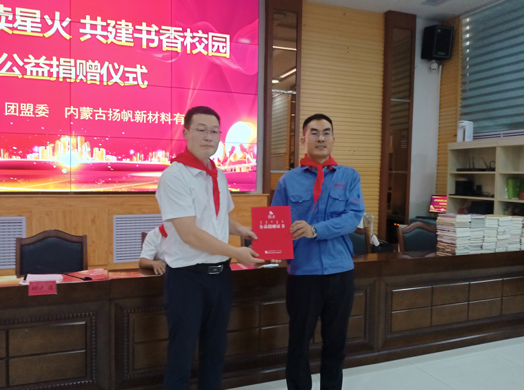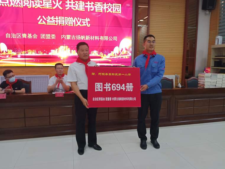 “贈一縷書香,傳一份真情”。為提升學生文化素養,推進書香校園建設,營造書香文明社會氛圍,引導同學們多讀書、讀好書,形成讀書熱潮,711日,由內蒙古自治區青少年發展基金會發起,團盟委協辦,揚帆新材子公司內蒙古揚帆參加的“點燃閱讀星火 共建書香校園”圖書捐贈儀式在阿拉善高新區第一小學舉行。